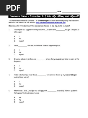 Procase01 Name Date Pronoun Case Exercise 1 I Me My Mine And Myself This Handout Accompanies Exercise 1 Of Grammar Bytes Get The Answers By Doing The Course Hero